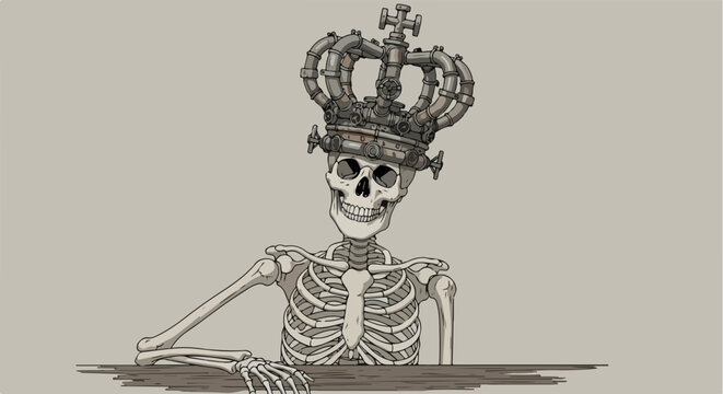 Crowned skeleton illustration with royal headwear resting on skull, bony fingers resting on edge. Detailed artwork shows a grinning crowned skeleton, emphasizing mortality and power symbol.