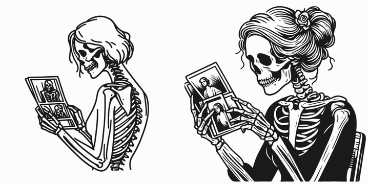 Female Skeleton looking through old photos. girl with messy bun Outline Clipart ink line art doodle vector illustration. Bony woman viewing antique picture album. retro memory bone.