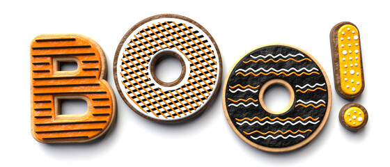 A bright orange word with a white exclamation point. The word is "boo" and it is written in a bold, playful font. The image is a Halloween-themed design, with the word "boo" being the main focus