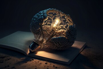 Concept of knowledge, education with open book and human brain. Generative ai.