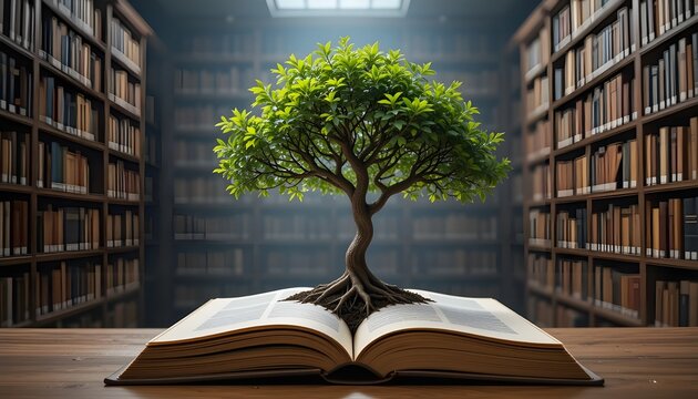 The concept of education by planting a tree of knowledge in the opening of an old book in the library and the magical magic of light that flies to the destination of success. Beautiful background