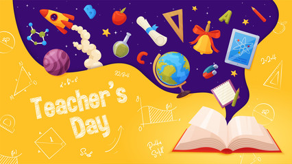 Teacher day banner. Template for sale page design. Cartoon and colorful style. Open book with flying elements: rocket, school supplies, stars, letters,  ruler, notebook, pencil.