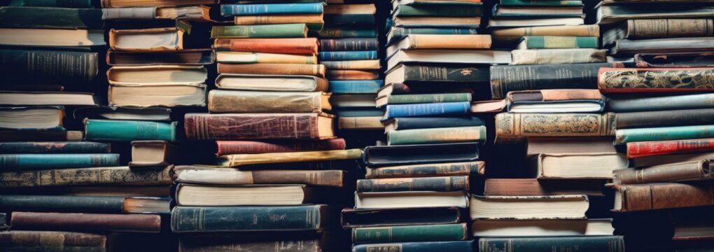 Female hands holding pile of books over light blue background. Education, self-learning, book swap, hobby, relax time
