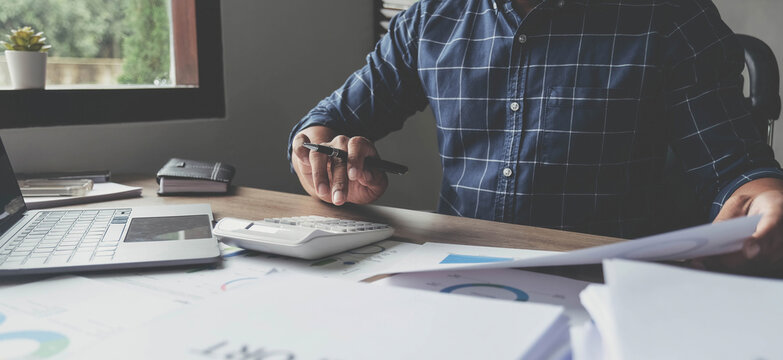 businessman hand using calculator and working with laptop calculate about finance accounting at coffeeshop outdor.finance accounting concept