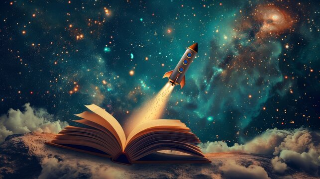 Open book with rocket launching into space filled with stars and galaxies, imagination and adventure concept