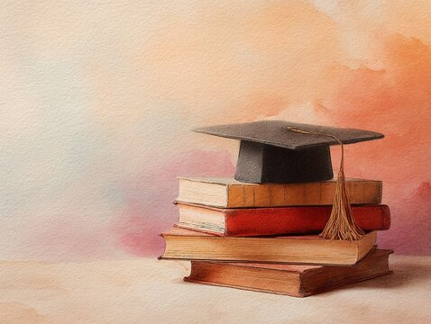 graduation cap and stacked books set against a soft watercolor backdrop, warm hues with ample space for personalized text, elegant and inspiring composition. High quality. High quality