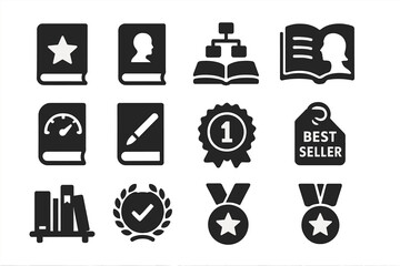 Line vector icons of reading tracker: book icon, chapter progress, bookmark, reading goal, genre tag, quote save, rating stars, reading streak.