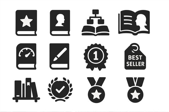 Book review clipart featuring stars and a pen rating a book from a tilted angle