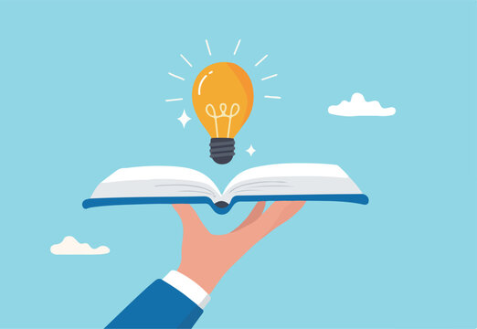 Knowledge or education, study or learning new skill, creativity or idea, reading book for inspiration, discover solution or literature, wisdom concept, hand hold open book to discover lightbulb idea