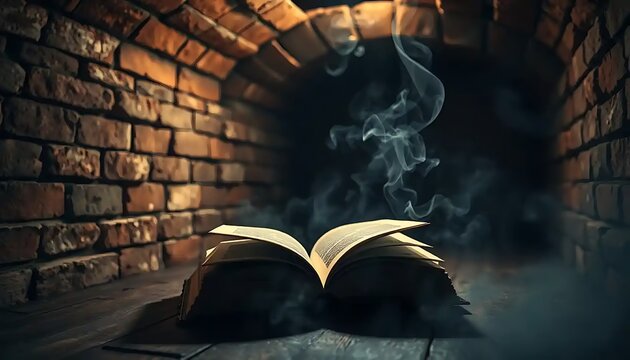 Mysterious open book releasing smoke inside brick archway, fantasy concept