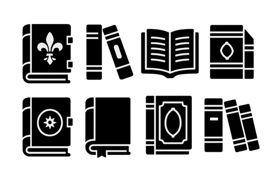 Vector illustration of a variety of book designs featuring decorative elements and binding styles