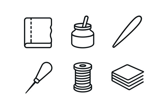 vector outline icons bookbinder (workbench): leather cover glue pot bone folder stitching awl thread spool stacked pages.