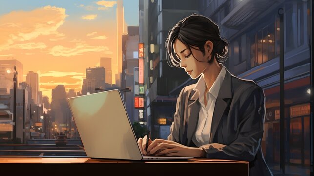 Young anime woman working on laptop at wooden table in cozy cafe with plants and books in background. Generative AI