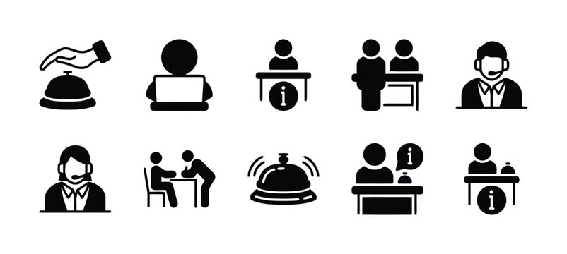 Reception services vector icons set contact us assistance information operator service desk hotel travel bell counter isolated