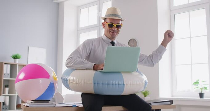 Happy business man in summer hat, sun glasses and swim ring sitting on office desk, working on laptop computer, typing, moving to music beat, having fun, and booking holiday online on Internet website