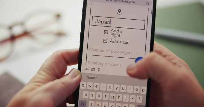 Hands, phone screen and booking flight for travel with information, location and search for discount. Person, smartphone and user experience for international trip with sale on app for plane ticket