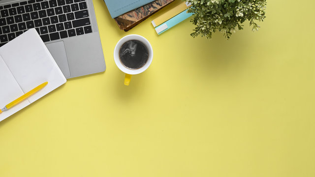 Top view image of colorful working table with accessories putting on it. Flat lay Computer laptop with white blank screen, pen, marker pen, notebook, diary, coffee cup and potted plant.