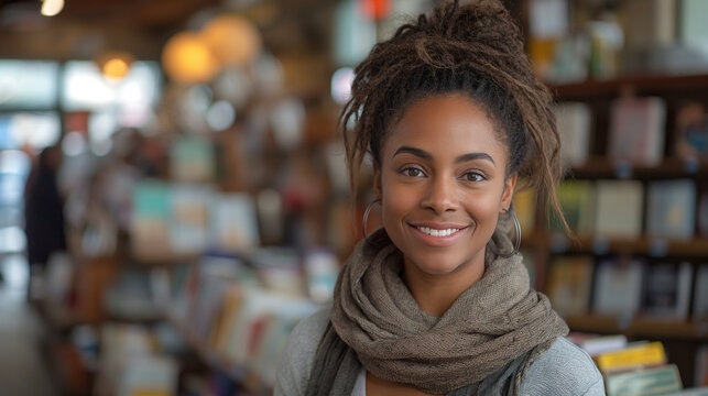 Portrait of happy black woman working in bookstore and looking at camera.