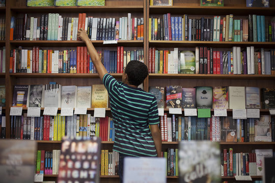 Boy (12-13) reaching for book in bookstore