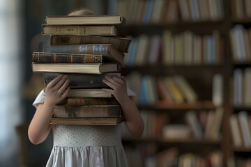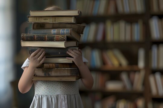 Child holding a towering stack of old books in a cozy library.