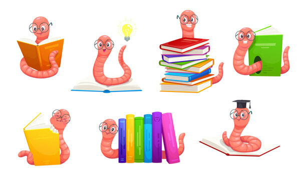 Cartoon cute bookworm characters in eyeglasses. Funny book worm animals vector set. Adorable smart larva personages reading, bite textbook cover, wearing mortarboard hat, having great idea light bulb