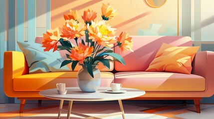 Dynamic color schemes incorporating energizing hues like orange and yellow, boosting mood and motivation. Painting Illustration style, Minimal and Simple,