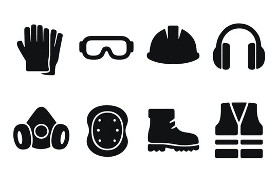 Safety Equipment Icons. Solid, filled icon set of repair safety equipment: gloves, safety goggles, helmet, ear protection, mask, knee pads, safety boots,