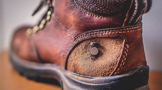 heel. Close-up of a worn leather hiking boot heel showing inner material and texture. lifestyle magazines, social media lookbooks, designed for lifestyle magazines and social media content.