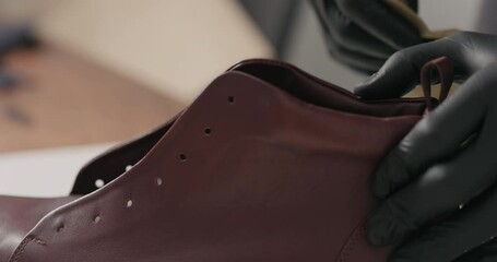 Close-up hands of unrecognizable shoemaker cleaning with brush old light brown leather shoe. Concept of cobbler artisan repairing and restoration work in shoe repair shop.