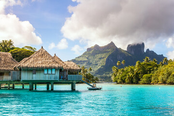 Overwater bungalows in the lagoon of Bora Bora, French Polynesia