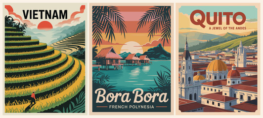 Retro travel destination posters featuring Vietnam, Quito, and Bora Bora. Vintage-style designs with iconic landscapes, bold colors, and mid-century aesthetics. Flat vector illustration set