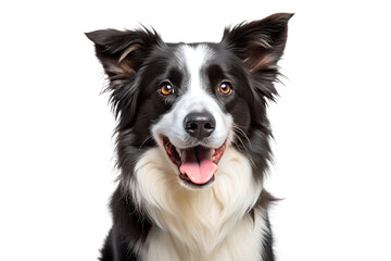 Closeup portrait of a happy border collie dog with its mouth open and tongue out, isolated on transparent background