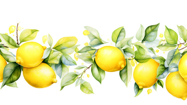 A vibrant border of juicy lemons, watercolor on white background, intricate details of the citrus texture and the verdant foliage.