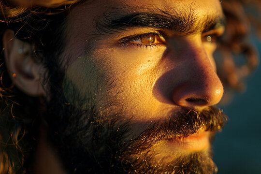 photograph of a person born under the zodiac sign Leo, in good lighting, iridescent colors of golden light, light gray, light orange and light green, play of light and shadows Concept of astrologers.
