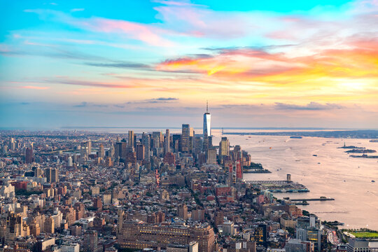 A spectacular, elevated panoramic view of the Downtown Manhattan skyline and surrounding boroughs under a vibrant sunset sky.