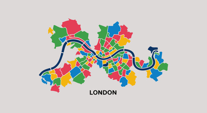 London City Map Illustration: A vibrant and stylized depiction of London's intricate layout, showcasing its boroughs with a creative use of color and emphasizing the Thames River.