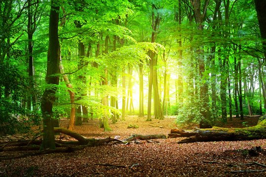 Side lit trail through Amerongse bos. Beautiful conditions on stunning morning walk