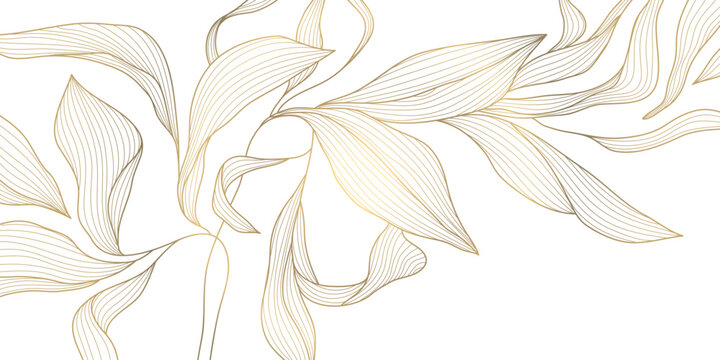 Vector golden flower background, luxury abstract line leaves composition. Art deco floral ornament, elegant summer print. Foliage drawing, vintage illustration