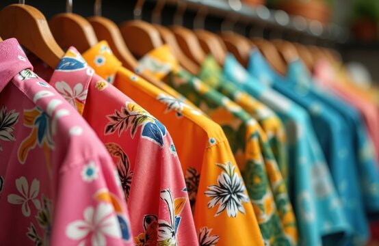 Colorful Hawaiian shirts hanging on wooden hangers. Vibrant shirts feature tropical floral motifs, embodying vacation spirit. Apparel display for summer season, beach party event or casual holiday.
