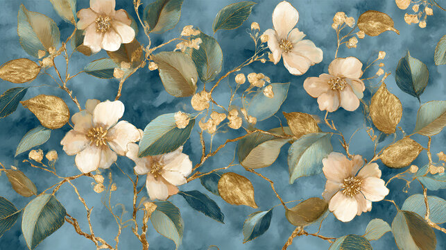 botanical wallpaper with cream flowers and teal leaves elegant floral mural with gold accents on blue