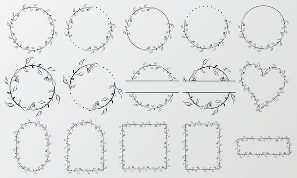 Laurels frames branches with circle borders vector collection. Vintage floral wreaths with leaves , flower, herb, swirls, ornate. Decorative elements for logo, wedding invitation, banner, packaging