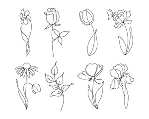 Vector set flowers illustration. 28 elements with botanical flowers outline with leaves in black isolated on white background. Ornate contour Anthurium flowers for summer design or coloring book.