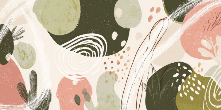 Scattered dark leaves form an abstract pattern on a light speckled background. The textured botanical elements create a minimalist and modern design with organic shapes and fine details.
