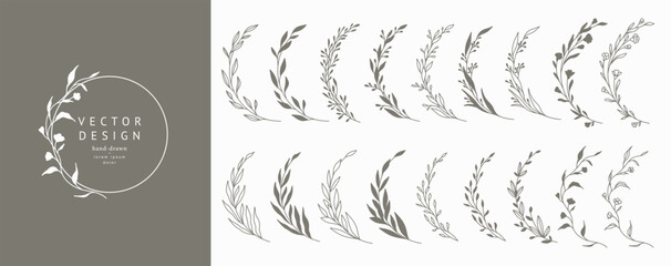 Hand drawn botanical floral elements in line art and silhouette style. Flowers, branches and leaves. Vector set for label, logo, corporate identity, wedding invitation, wreath, frame, border.