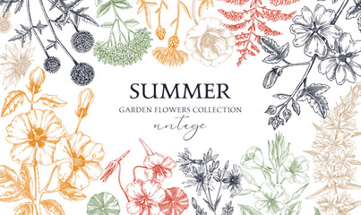 Hand drawn summer background. Garden flowers frame design in sketch style. Vinatge botanical illustration in color. Floral banner for prints, cards, posters