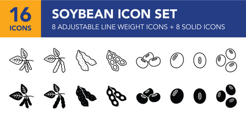 Soybean icon set with pods, leaves, and beans – 16 black & white farming icons in line and solid style. Editable stroke weight for agriculture, organic, eco-friendly, and plant-based projects.