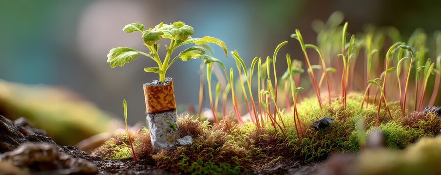 smoking cessation program concept. New plant growth on mossy surface in vibrant colors.
