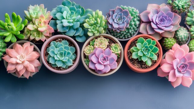 From above, cactus succulents in a planter, with color background. 1