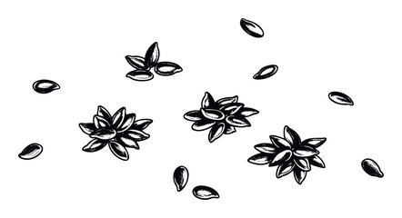 Hand drawn black and white seeds scattered and grouped in a natural style perfect for organic food branding, culinary publications, or healthy living promotions.