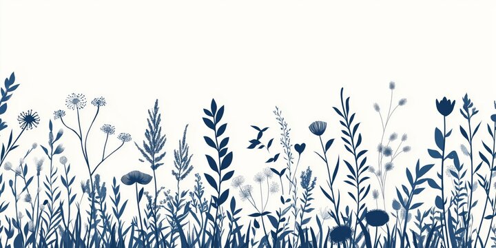 Elegant botanical illustration featuring diverse blue wildflower and grass silhouettes. Seamless horizontal pattern ideal for nature-inspired designs and decor